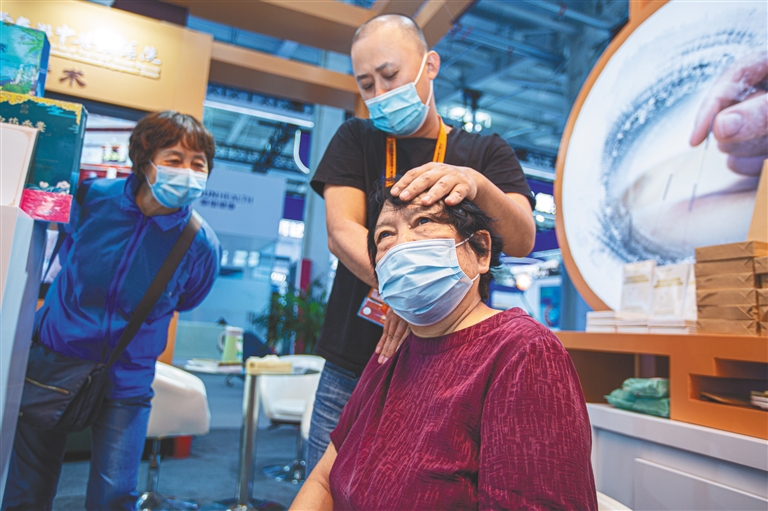在服貿(mào)會首鋼園會場,游客在體驗三亞市中醫(yī)院提供的中醫(yī)按摩。